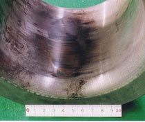 実機使用の結果、図4に示すようにサイアロン軸受の使用面は摩耗が少なく、また滑らかであるため相手材である軸を摩耗させる度合いも小さくなりました。表1に軸受にサイアロン、従来材質であるWC-Co溶射を適用した場合の軸受の平均半径摩耗 量、および耐摩耗性比較を示します。ロール軸は従来材質であるWC-Co溶射の場合です。表1に示すように軸受サイアロン化で大幅な耐摩耗性向上が達成できました。効果として、① 軸受寿命の大幅向上、②ラインスピードの向上、③軸受に起因する浴中機材交換が不要になり、操業日数が延長され、大幅な生産性向上が達成できました。