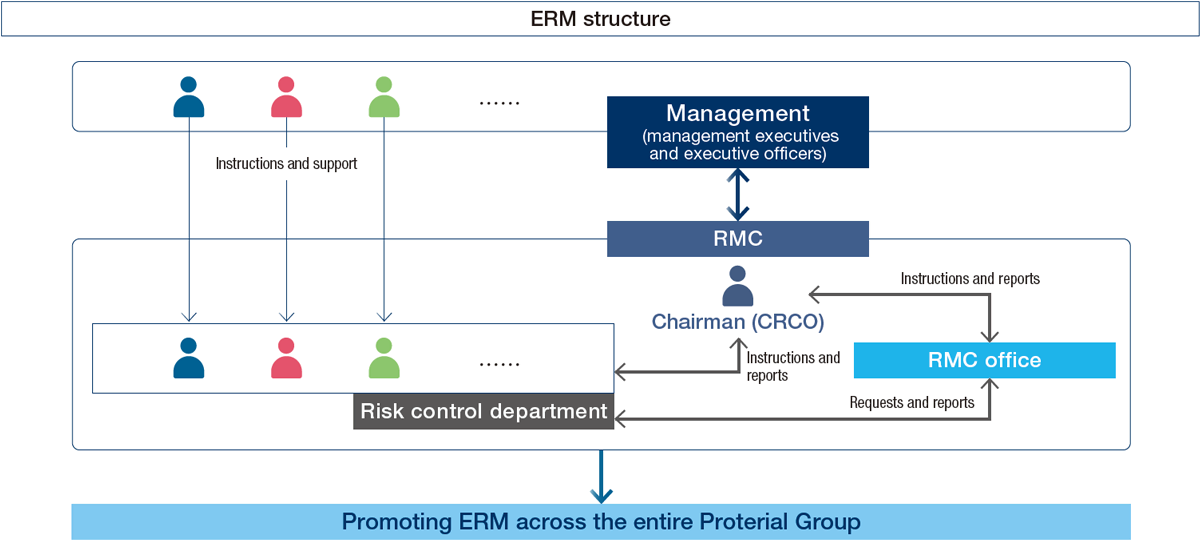 In addition to a bottom-up approach, the Group has established an Enterprise Risk Management (ERM) system in which management (management executives and executive officers) uses a top-down approach to identify and control cross-sectional and medium- to long-term risks from a management perspective. The Risk Management Committee (RMC), chaired by the Chief Risk Control Officer (CRCO), implements ERM processes such as risk identification, assessment, and prioritization, and promotes ERM throughout the Group. Risks are classed and defined as strategic risks, operational risks, and company-wide risks, and the extracted risks are evaluated on a four-level scale based on their impact and likelihood of occurrence. A risk map is created based on the assessment results, and priority risks are selected from the risks positioned in the "high" zone, taking into account their importance and urgency, and are managed by implementing countermeasures and monitoring through RMC. Risks related to climate change identified by the Group Environmental Committee, corporate departments, and business divisions are considered to be risks related to environmental regulations, etc., and are monitored by the RMC as target risks for ERM, along with other risks. The RMC shares the status of risk responses and related monitoring results, and reports to management.