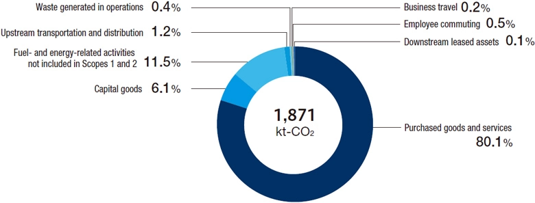 The Company calculated CO2 amount for Scope 3 Categories 1 to 7 and 13 according to “Basic Guidelines on Accounting for Greenhouse Gas Emissions Throughout the Supply Chain.”CO2 emissions in fiscal year 2024 totaled 1,871 kt-CO2, of which “Category 1: Purchased Goods and Services” accounted for the largest share (80.1%).